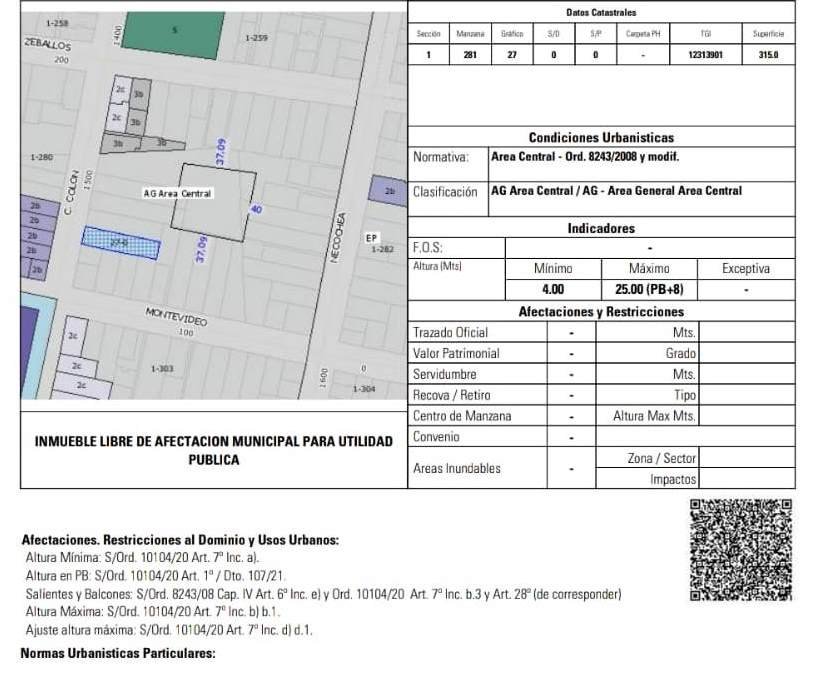 LOTE EN VENTA DE 315 M2 CON POSIBILIDAD DE CONSTRUIR PB Y OCHO PISOS. FRENTE 8.66 MTS FONDO 36.37 MTS